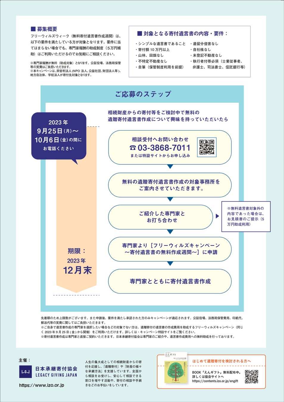10月7日(土)以降も12月31日(日)までは、専門家報酬の一部(5万円分)が助成されるキャンペーンも行われています。遺贈寄付をご検討されている方は、ぜひこの機会をご活用ください。