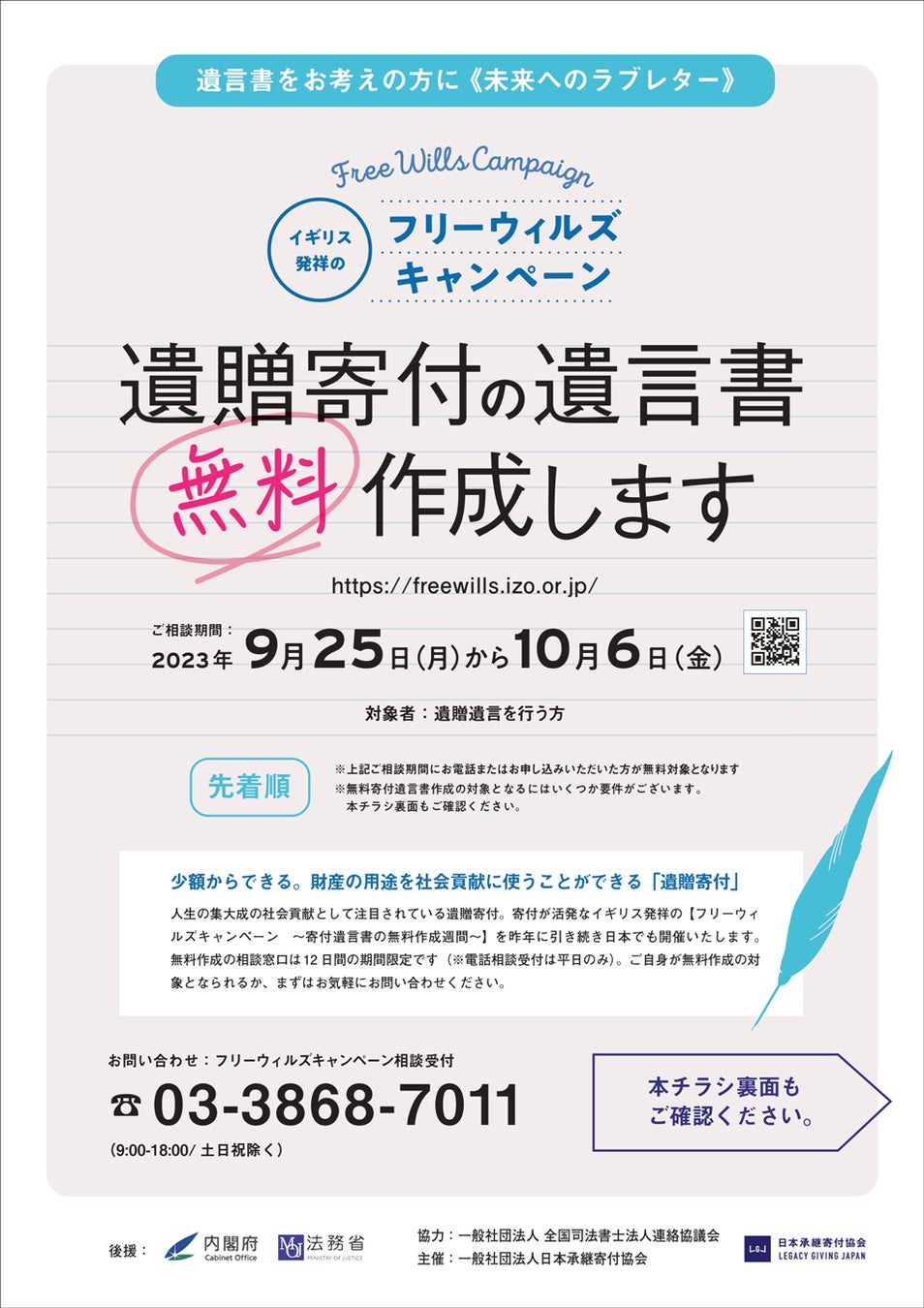 寄付遺言書の作成料が助成される「フリーウィルズキャンペーン」が、今年も 9月25日(月)より実施されることになりました。