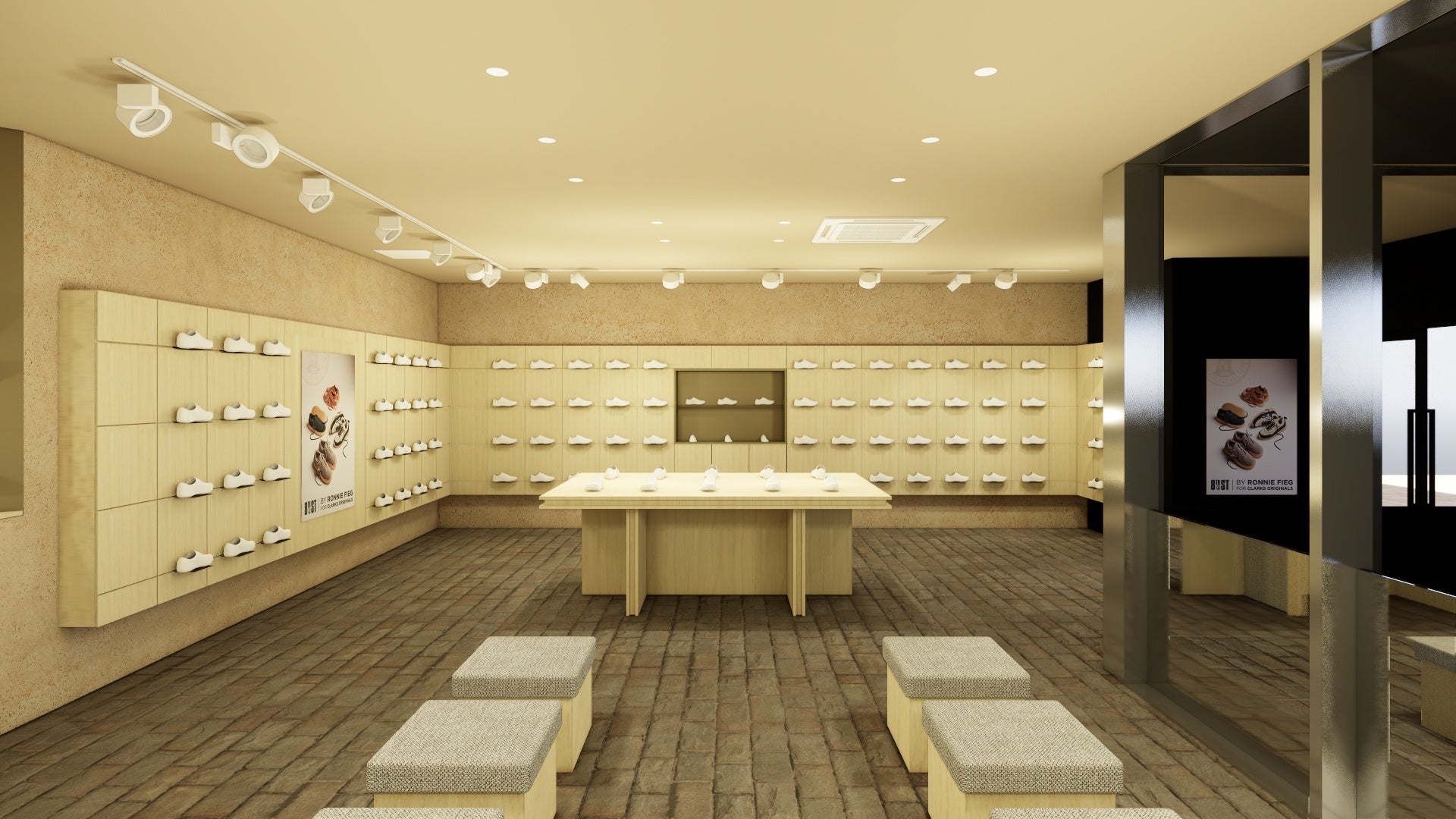 クラークス オリジナルズ ストア KYOTO は、面積110m²(33.5 坪)、取扱品番数は約130点を予定しております。