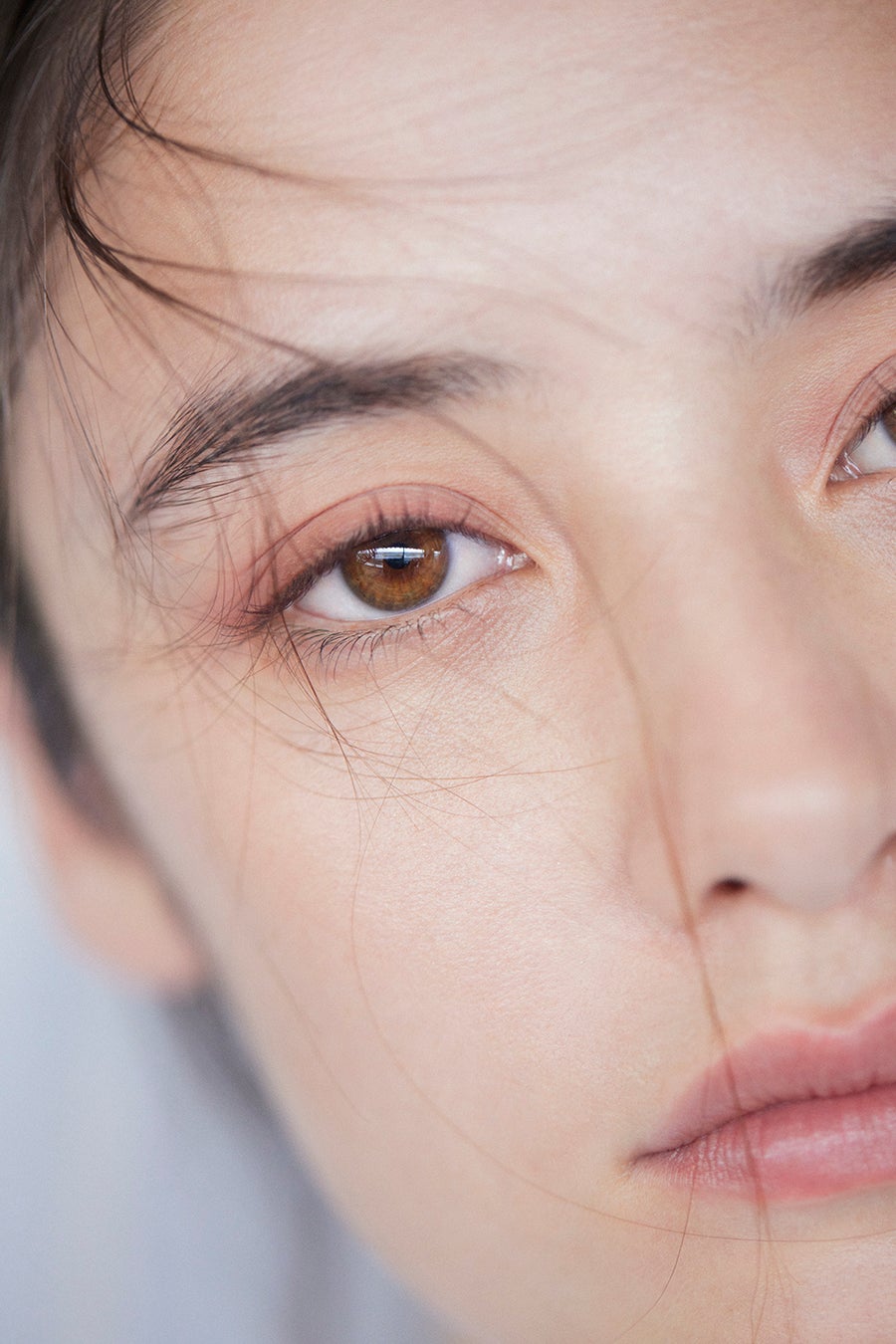 目もとを引き締めながら特別な血色感を添えていくアクセントカラーに、表情の異なる2種のブラウン、そしてまろやかな明るさを上掛けするホワイトピーチベージュを組み合わせました。