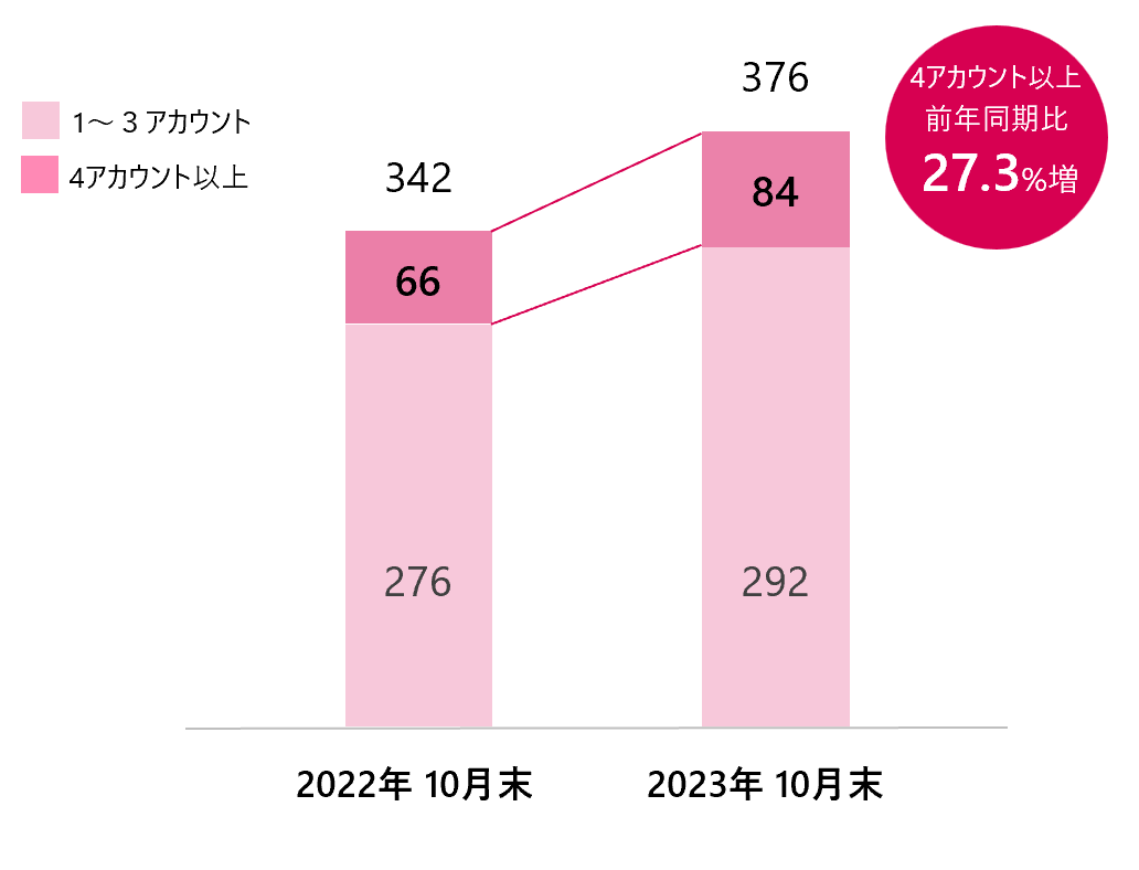 「コムニコ マーケティングスイート」の有償契約アカウント数は、2023年9月に累計4,000件を突破しており、現在も増え続けています。契約アカウント数が増える背景のひとつとして、1社の契約において、4アカウント以上の複数アカウント契約をされるお客様が増えていることが挙げられます。2022年10月末時点と2023年10月末時点の契約社のうち、「4アカウント以上(※1)」契約をしている企業の数を比較すると、「66社」から「84社」と、27.3%増えています。多数のブランドを展開する企業が、ブランド毎でSNSアカウントを開設し運用することがスタンダードになっていることや、複数アカウントを一元管理することでSNS起因のリスクを防止することに繋がるという観点から、複数アカウントを一括管理できるツールへの需要が高まっているものと考えております。