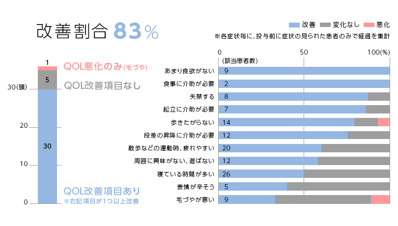 9歳以上の犬36頭に幹細胞を投与し、投与前と投与一ヶ月後に食事や歩行等に関する11項目について比較したところ、投与した8割(30頭)の犬において何等かの項目の改善が見られました。特に食事や活動性に関する項目で改善割合が高くなっていました。
