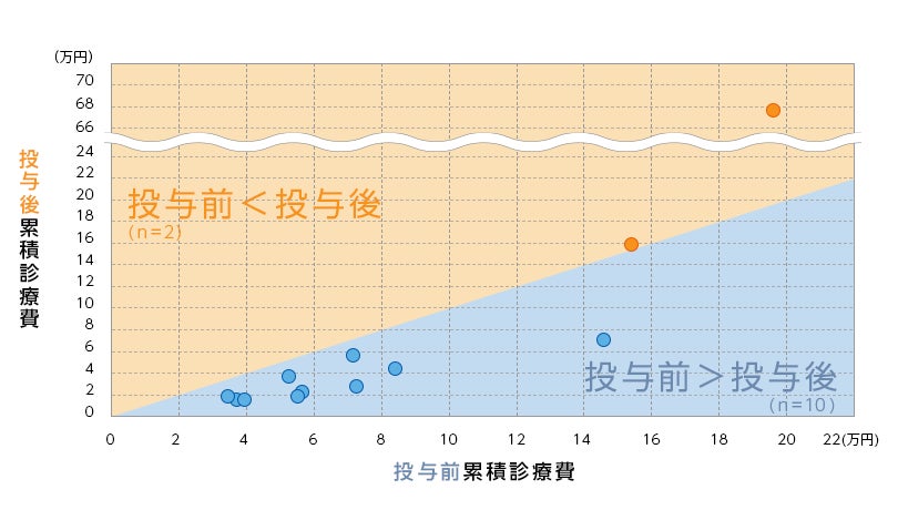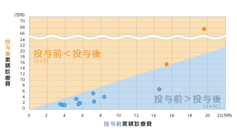 次に幹細胞を投与した11歳以上の12頭について、投与前後半年間の動物病院での診療費を比較したところ、10頭で診療費の低減が確認されました。通常は加齢に伴い診療費が増加するにもかかわらず、診療費が低くなっている、つまり幹細胞投与には若返りの効果があると言えるのではないかと考えられます。