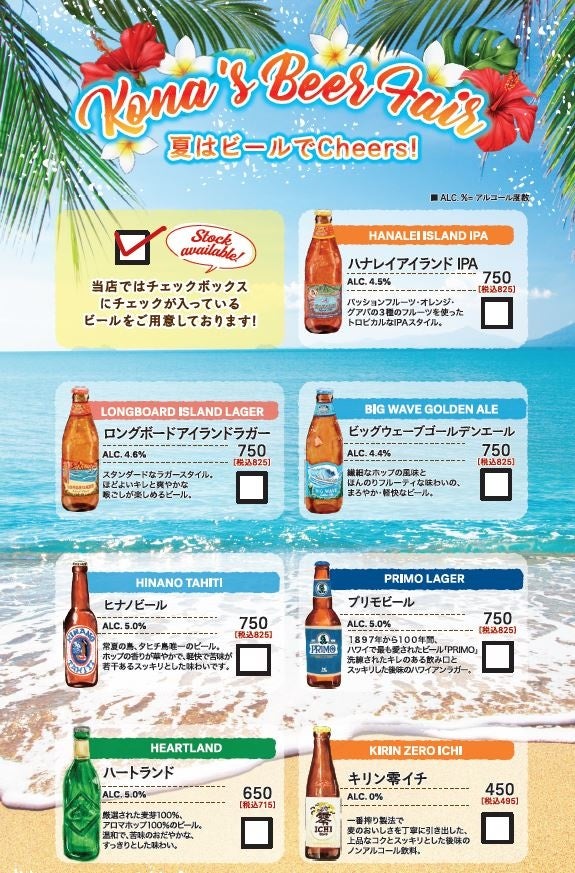 コナズ珈琲のグランドメニューで常時ご提供しているハワイのビールとして馴染みのある『ロングボードアイランドラガー』、『ビッグウェーブゴールデンエール』をはじめ、伝統的なハワイアンラガービール『プリモ』、常夏の島タヒチ島唯一のビール『ヒナノ』も特別にご用意いたしました。