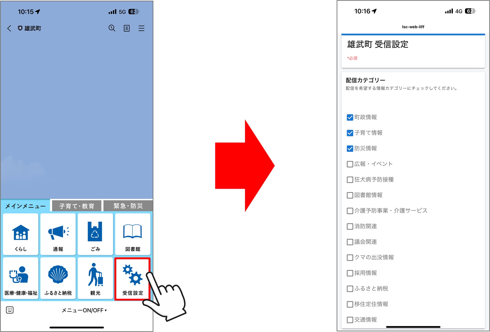 住民の希望に応じた配信だけを届ける「セグメント配信」機能を導入、欲しい配信カテゴリーを「受信設定」に回答することでカスタマイズすることができます。住民がほしい情報に絞って配信ができるため、町からの情報発信がこれまで以上に効果的になることが期待されます。