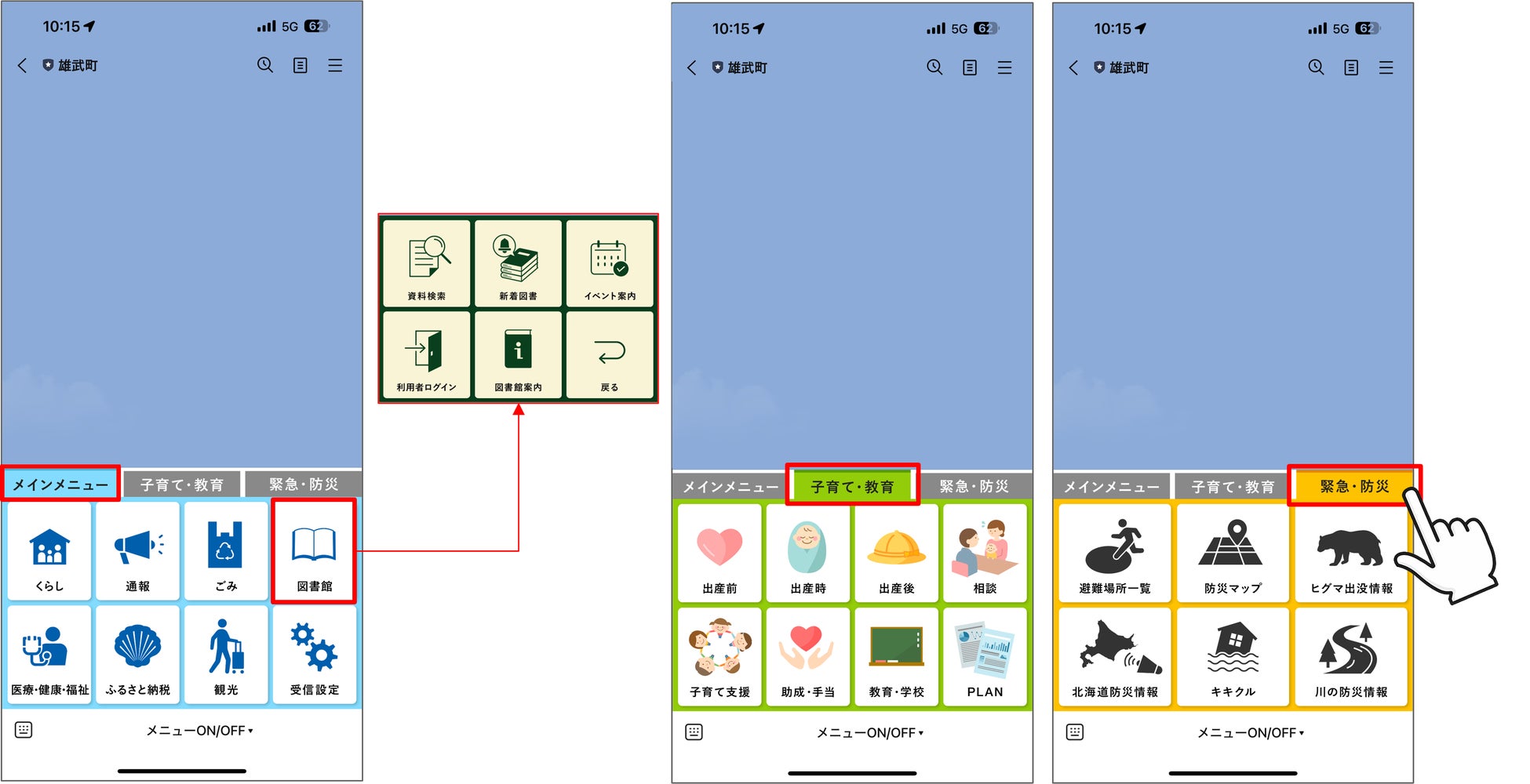 画面下部に固定されている「メインメニュー」「子育て・教育」「緊急・防災」の3つのリッチメニューから、各種情報が掲載されているWebサイトに遷移することができます。従来はホームページを検索し、該当ページにアクセスすることで得ることができた情報ですが、今後はLINEのトーク画面から手軽に情報源にたどり着くことができます。