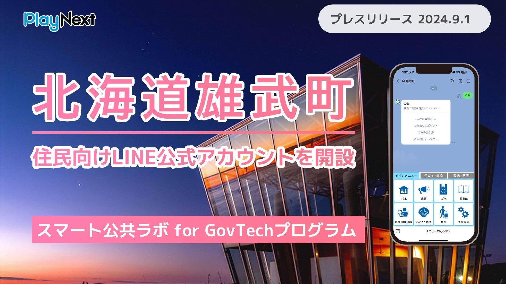 プレイネクストラボ株式会社(本社:東京都品川区、代表取締役:柏 匠、以下 「プレイネクストラボ」)の提供する「スマート公共ラボ for GovTechプログラム」が、北海道雄武町(以下「雄武町」)のLINE公式アカウントに採用され、2024年9月1日(日)より一般公開したことをお知らせします。