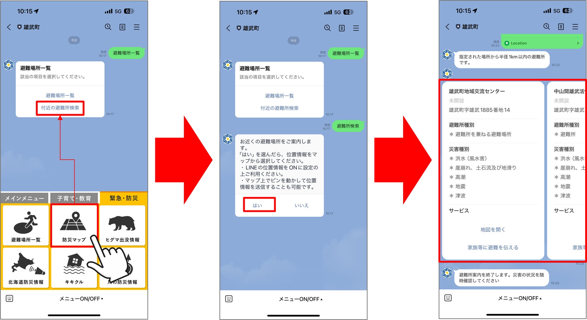 画面の流れに沿って自身の位置情報を送信すると、近くの避難所施設一覧を検索することができます。普段から近くの避難所を確認しておき、いざとなった際にもLINE公式アカウントを利用して、安心して行動することができます。