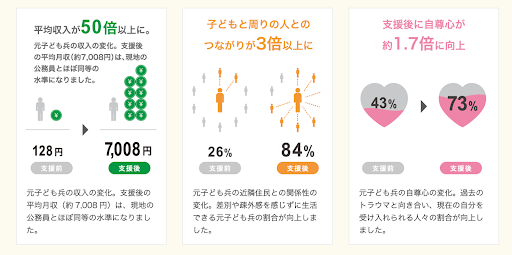 これまで、200名以上の元子ども兵が、テラ・ルネッサンスの社会復帰支援を受け、自立を果たしてきました。彼ら・彼女らの頑張りもあり、支援前は平均月収が128円でしたが、支援後は7,008円になり、現地の公務員とほぼ同等の水準になりました。また、地域の人々との関係も改善し、自尊心も向上し、過去のトラウマと向き合い、現在の自分を受け入れられる人々の割合が向上しました。