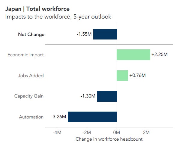 ServiceNowと英教育出版ピアソンの調査「2024 Workforce Skills Forecast(2024年の労働力スキル予測)」によると、AIの活用が進むことで労働市場が大きく進化すると予測されています。日本経済は年率1.0%で成長するとされ、この成長を維持するには、今後5年間で225万人の労働人口の追加が必要です。さらに、AIなどの新たなテクノロジー関連の雇用として76万人が求められています。AI活用によって456万人分の労働力を代替できる一方で、高齢化による人口減少を考慮すると、2028年までに155万人の労働力不足が見込まれています。