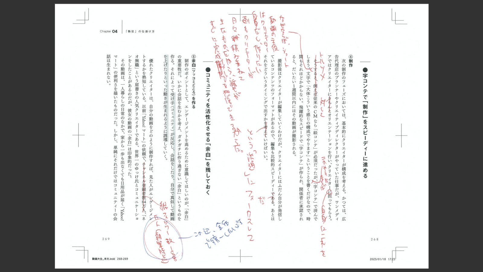発売に先駆けて、本書の執筆プロセスを振り返るトークセッションを2023年3月中旬に開催いたします。イベントは本書の赤字入り原稿を投影しながら、三浦崇宏氏(The Breakthrough Company GO 代表 PR /クリエイティブディレクター)と対話。明石ガクトの思考プロセスを解き明かすトークセッションとなる予定です。『動画大全』の内容をより深く理解できる内容となっております。
