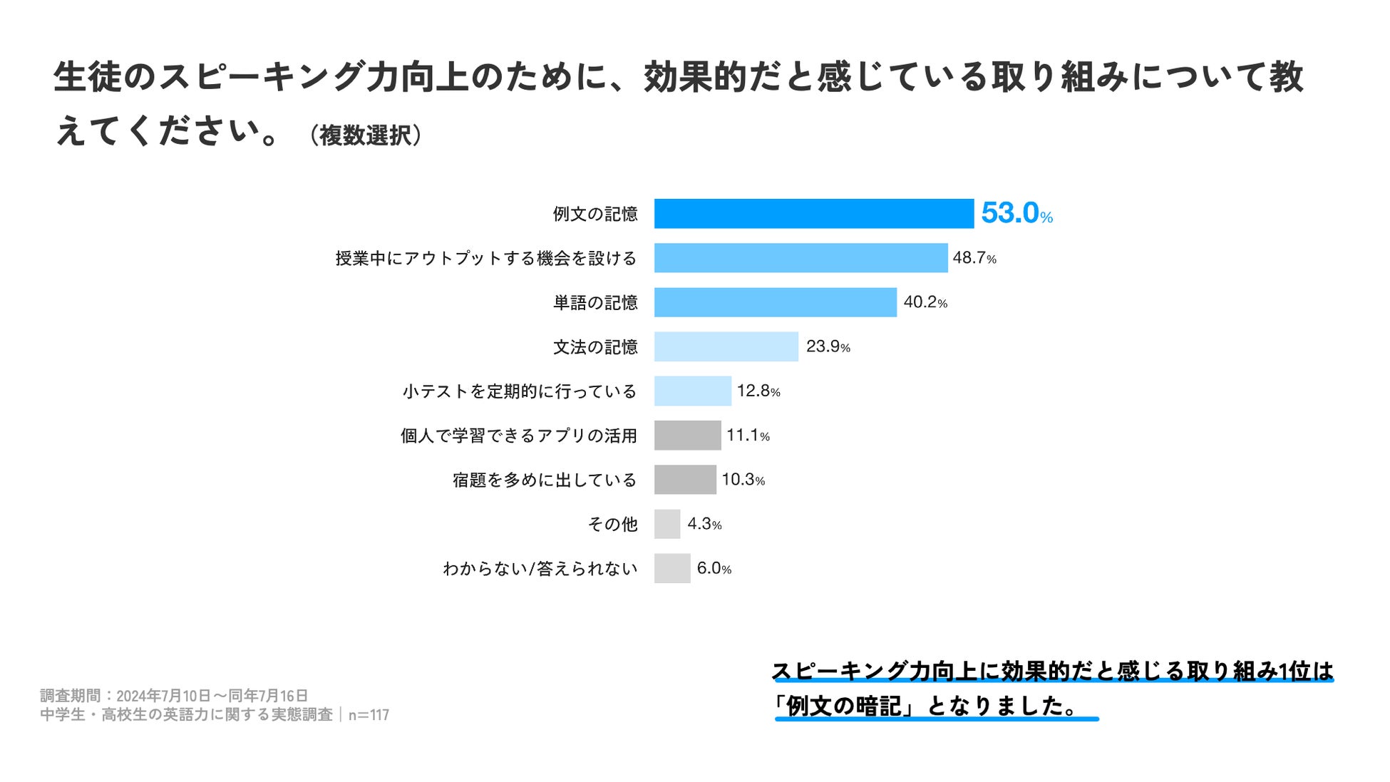 「生徒のスピーキング力向上のために、効果的だと感じている取り組みについて教えてください」(n=117)と質問したところ、「例文の記憶」が53.0%と最も多い回答となりました。次いで「授業中にアウトプットする機会を設ける」が48.7%、「単語の記憶」が40.2%という結果となりました。