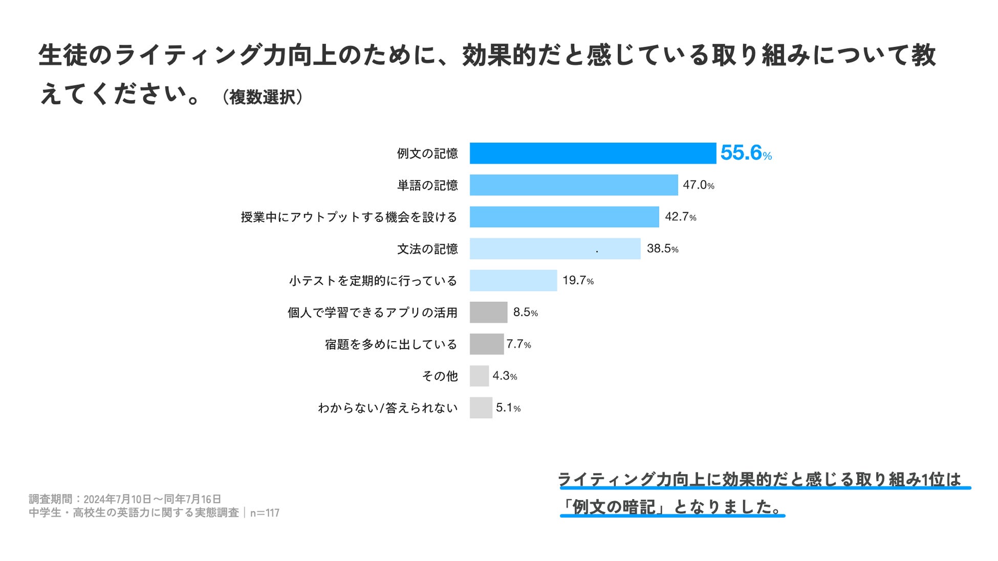 また、「生徒のライティング力向上のために、効果的だと感じている取り組みについて教えてください」(n=117)の質問についても、「例文の記憶」が55.6%と最も多い結果となりました。他には「単語の記憶」が47.0%、「授業中に演習する機会を設ける」が42.7%と上位の回答となりました。