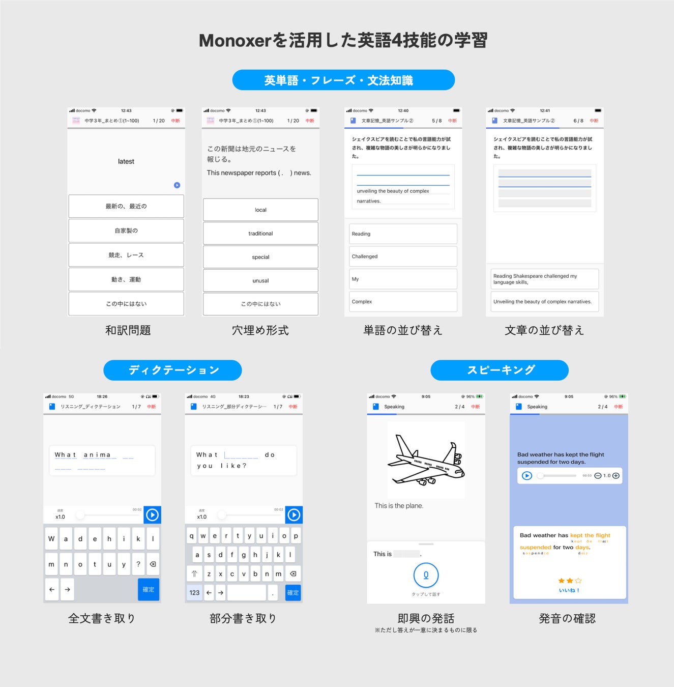 Monoxerでは、英語4技能(リスニング、スピーキング、リーディング、ライティング)に必要な基礎的な知識やスキルを総合的に学習できます。学習目的に応じて様々な問題形式に対応しており、各形式で記憶定着に最適なヒントの量が自動で調整され、問題の難易度もAIが個別に最適化して出題します。