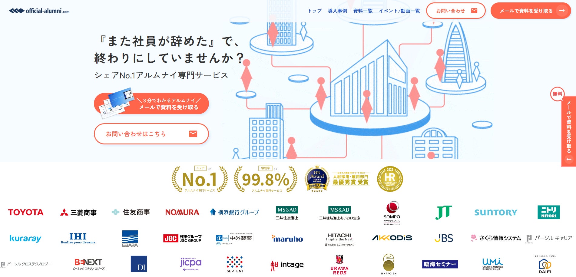 企業とアルムナイ(退職者)が退職後もつながる「企業と個人の新しい関係」の実現に向けて、アルムナイ特化型クラウドシステム『Official-Alumni.com』( https://official-alumni.com/)の提供やコンサルティングのほか、退職で終わらない企業と個人の新しい関係を考えるメディア『アルムナビ』( https://alumnavi.com/ )を運営しています。
