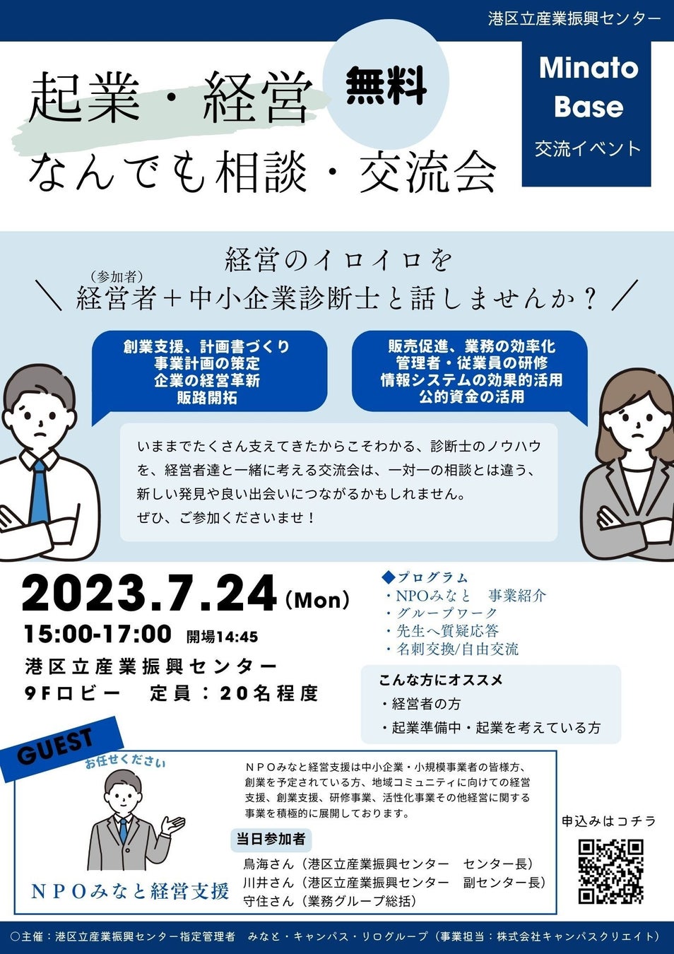 港区立産業振興センター(所在地:東京都港区)では、7月24日に【Minato Base 交流イベント】 "無料" 起業・経営なんでも相談・交流会を、経営者・起業予定者を対象に開催いたします。