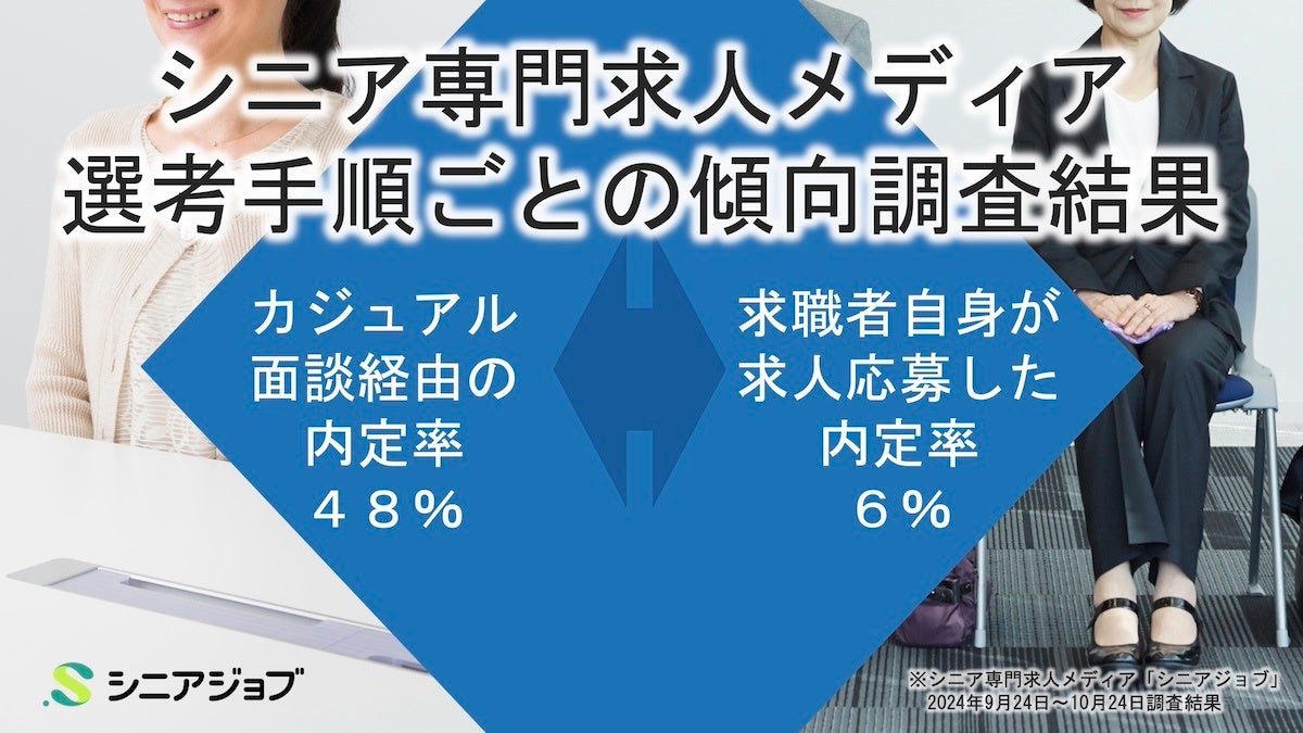 2024年9月24日から同10月24日までの1カ月間で、求人メディア「シニアジョブ」を活用して内定を獲得したシニア求職者について、「オファー」や「カジュアル面談」など選考手順の違いによる傾向を調査した結果の主要ポイントは次の3点です。