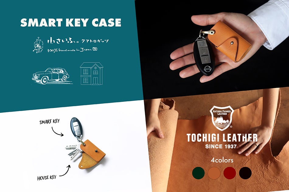 車のスマートキーと家の鍵を取り付けることができる革のコンパクトなスマートキーケース。 小さな女性の手にもすっぽり収まり13g(約ボールペン1本分)と超軽量につくられました。小さいふ専門店の革職人がコンパクトさにこだわってハンドメイドしたキーケースです。
