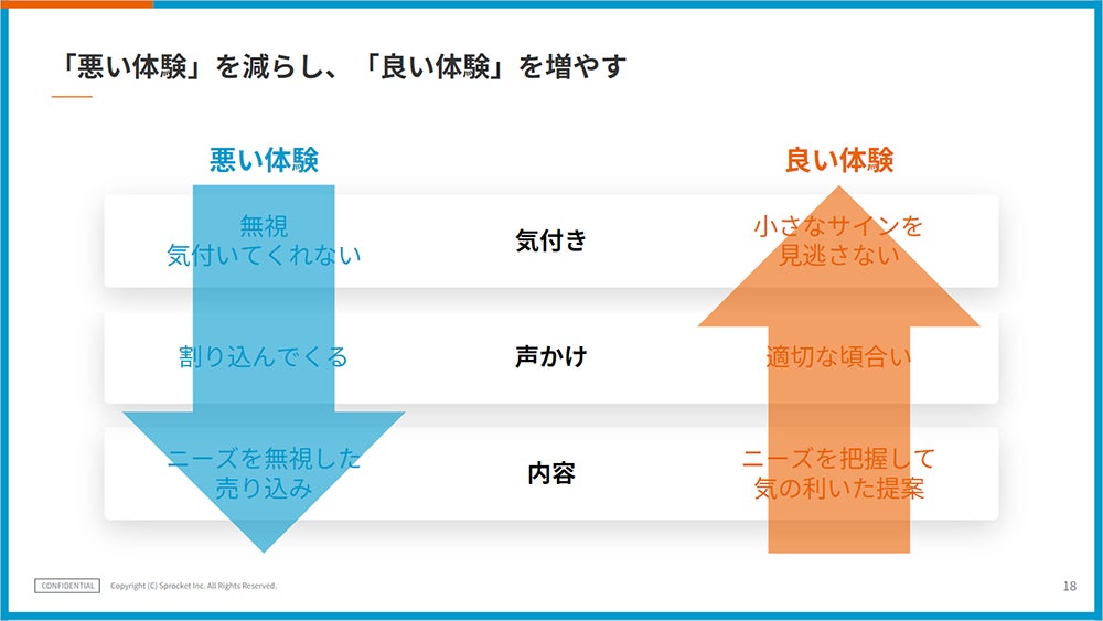 リアル店舗では、スタッフがお客様の様子を観察して、困りごとや心理を読み解いてコミュニケーションを図っています。しかし、コミュニケーションのすべてが「良い体験」になるとは限りません。オンラインでも同様に「悪い体験を減らして、良い体験を増やす」ことを目指す必要があります。