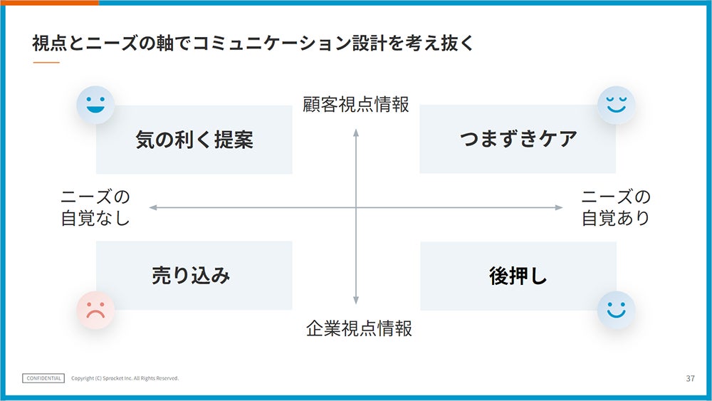 Sprocketでは「視点」と「ニーズ」の2軸でコミュニケーションを四象限に分類するフレームワークを活用しています。お客様視点の情報であれば、ニーズの自覚がない方でも「気の利いた提案」として受け止めてもらえます。オンラインではまず「売り込み」から入ってしまいがちですが、良くない体験を提供してしまうと、その後のCVRやLTVには当然つながりません。