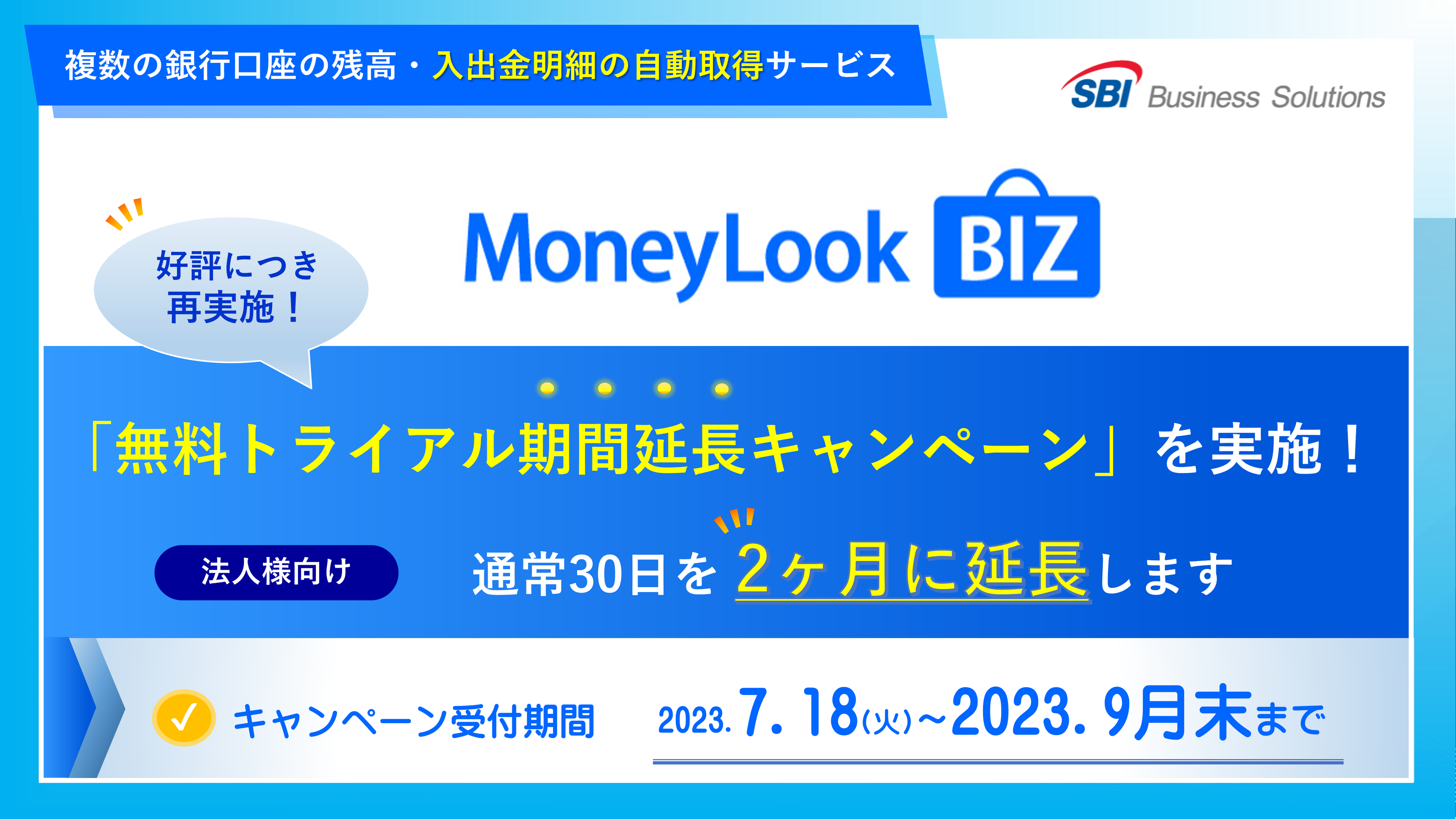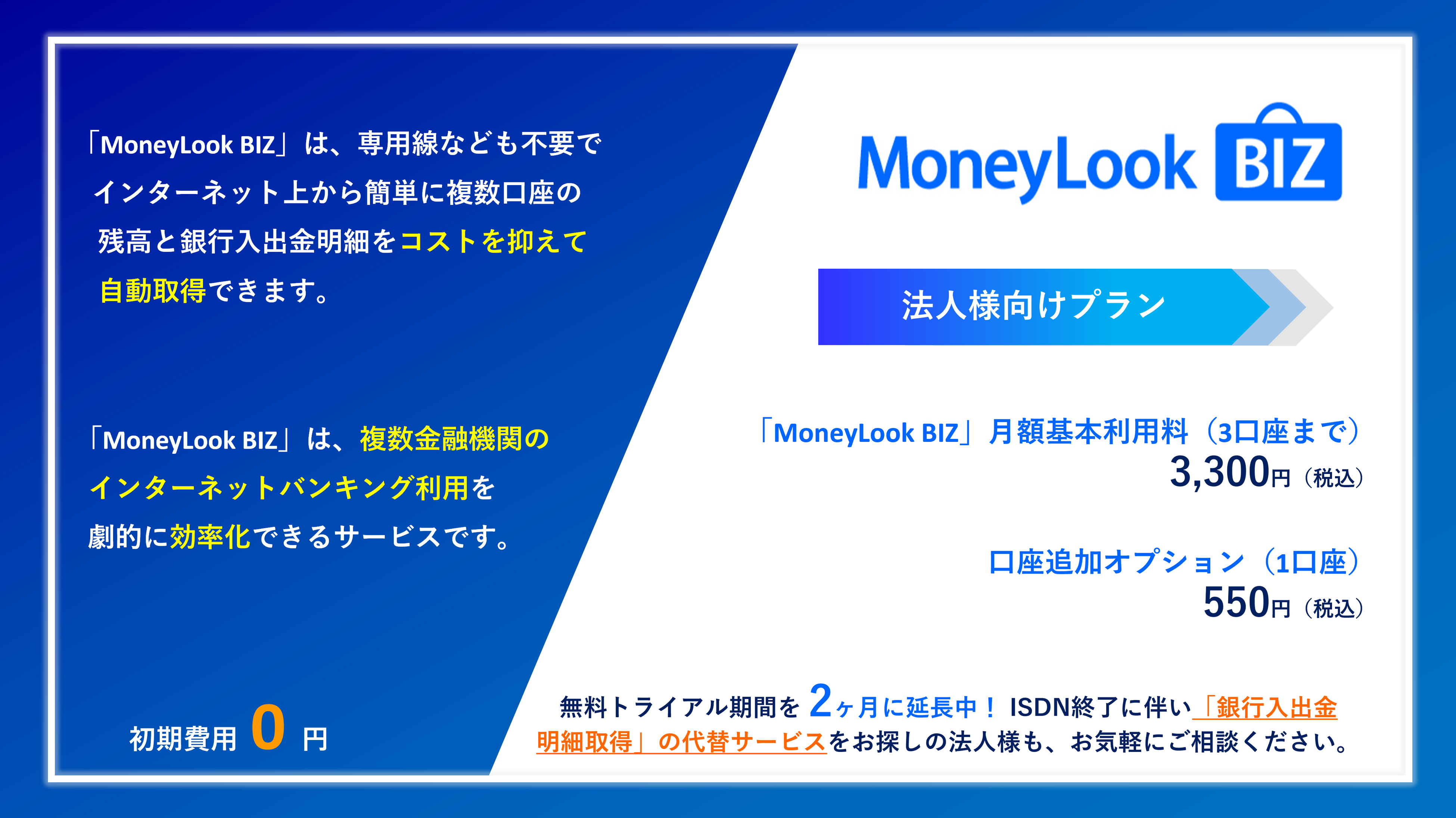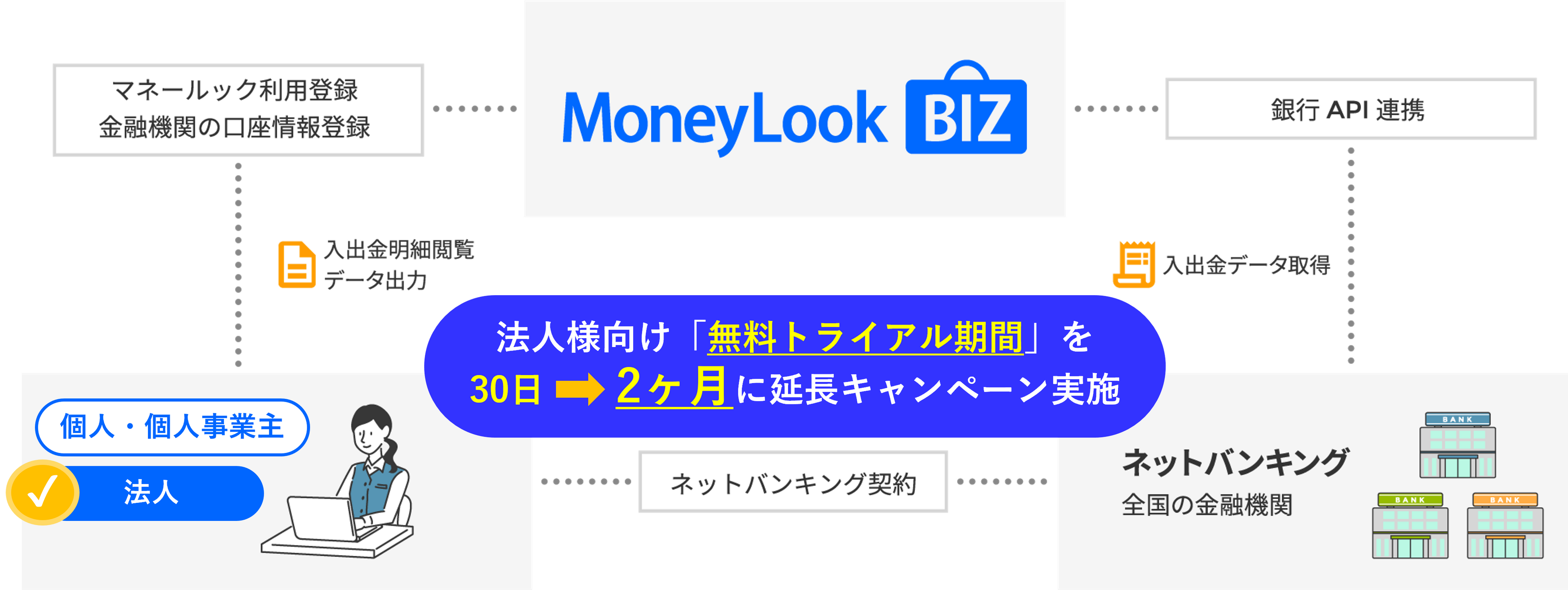 銀行入出金明細自動取得サービス「MoneyLook BIZ」、好評につき無料トライアル期間を2ヶ月に延長キャンペーンを再実施
