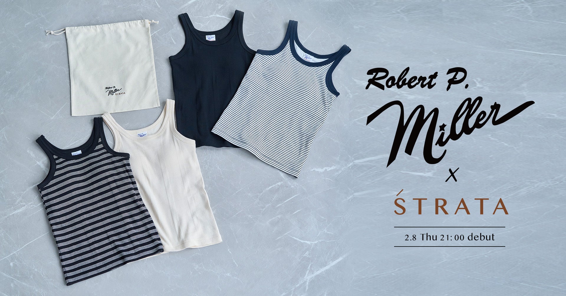 本コレクションでは、Robert P. Millerとの初コラボレーションも展開します。Robert P. Millerで定番のアメリカンスリーブデザインを小柄女性のためのオリジナルサイズにアレンジしたタンクトップの無地とボーダー2種、オリジナル巾着がセットになった特別なアイテムです。