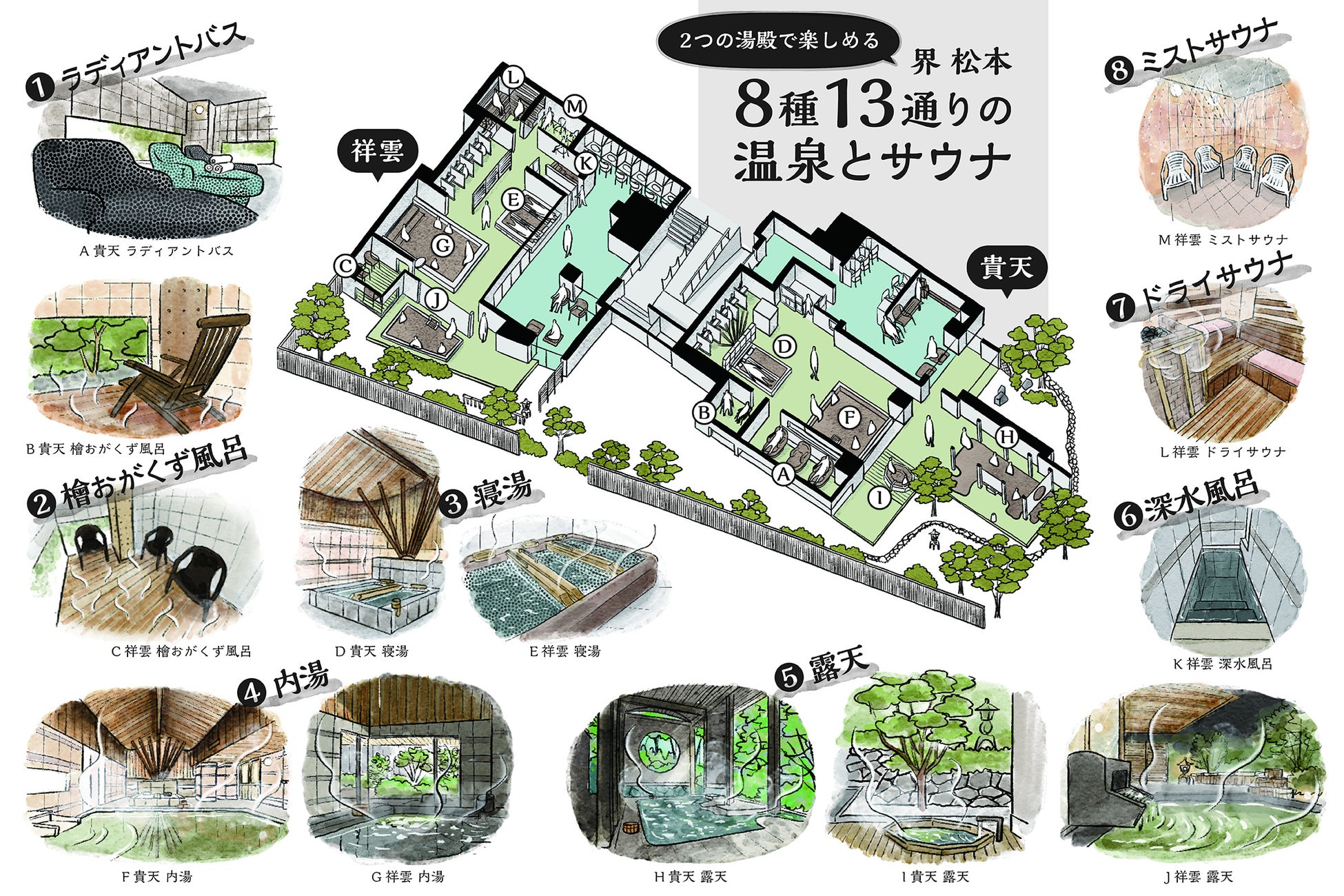 界 松本の大浴場(貴天・祥雲)の八種十三通りのお風呂の内にはドライサウナやミストサウナ、檜の香りを楽しむおがくず風呂、輻射熱でじんわりと身体を温めるラディアントバスといった四種類のサウナがあります。お部屋のサウナを含めると五種のサウナを完全プライベートな空間でゆっくり堪能できます。