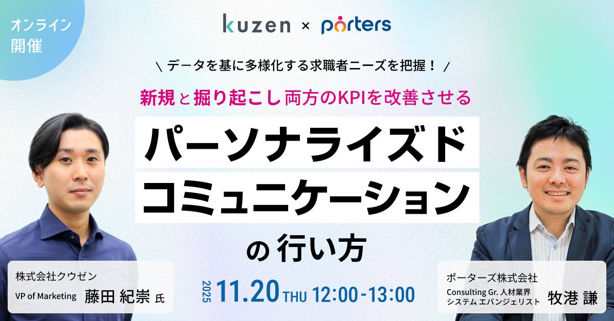 人材ビジネス向けマッチングシステムを提供するポーターズ株式会社(東京証券取引所グロース. 証券コード5126、東京都港区、代表 西森 康二)は、株式会社クウゼン(以下、クウゼン)と共同で「デ-タを基に多様化する求職者ニーズを把握! 新規と掘り起こし両方のKPIを改善させる『パーソナライズドコミュニケーション』の行い方」と題した無料セミナーを2025年11月20日(木)12:00~オンラインで開催いたします。