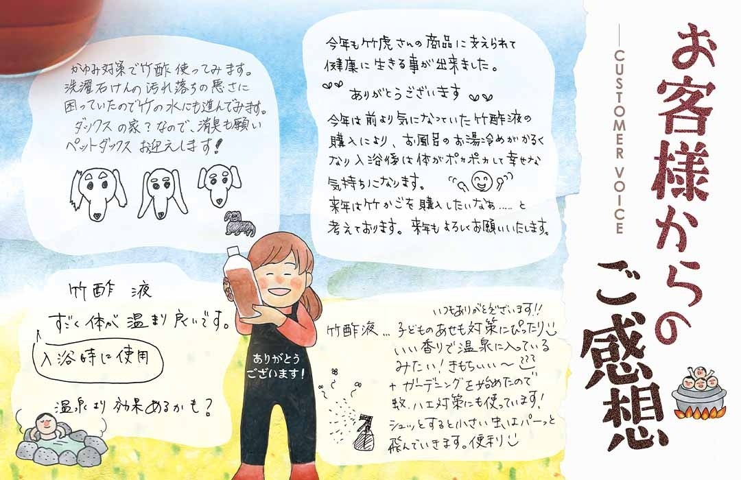 今回のフライヤーリニューアルのポイントとしては、実際に竹酢液をご愛用いただいているお客様からの感想を紹介し、使用感を具体的に伝えており、便利でお得な定期購入の仕組みを分かりやすく説明し、長期的な利用を促進しています。また、全体的に温かみのあるデザインに仕上げ、柔らかな色合いとレイアウトで、視覚的な魅力を強調し、親しみやすさを加えるため、スタッフが制作した4コマ漫画を掲載し、楽しく商品の特徴を伝えています。