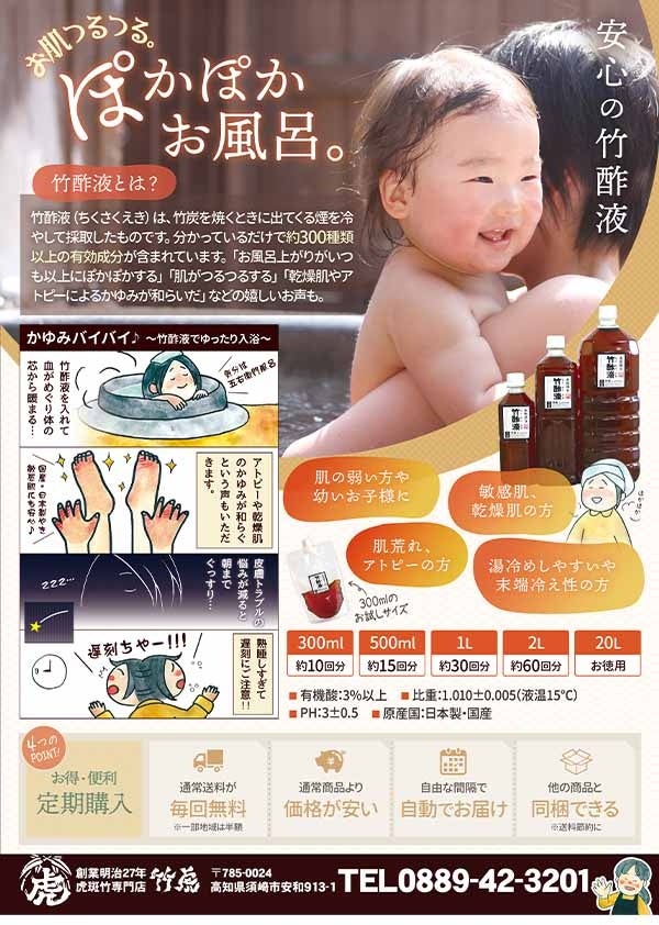 人気商品「安心の竹酢液」のフライヤーがリニューアル!お客様の声や定期購入の案内を掲載し商品の魅力を伝えています。四国産の竹を使い伝統的な製法で丁寧に作られた竹酢液は、入浴剤などにおすすめです。