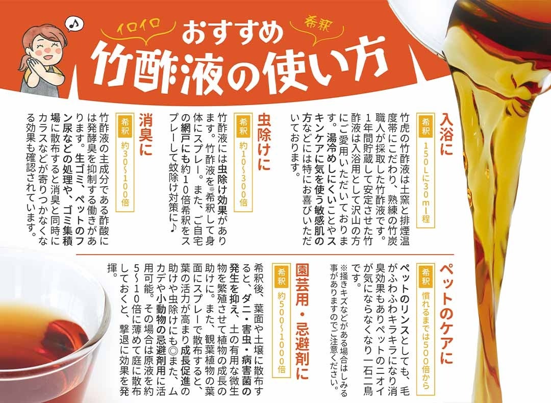 創業明治27年(1894年)より竹材・竹製品製造卸業として皆様にご愛顧いただいている竹材専業メーカーである、虎斑竹専門店 竹虎(運営:株式会社山岸竹材店)です。弊社の定番人気商品である「安心の竹酢液」のフライヤーがこのたびリニューアルされました。竹酢液は、竹炭の製造過程で得られる煙を冷却して採取した天然の水溶液であり、その高品質さから入浴剤やスキンケア、消臭剤として多くのお客様にご愛用いただいております。