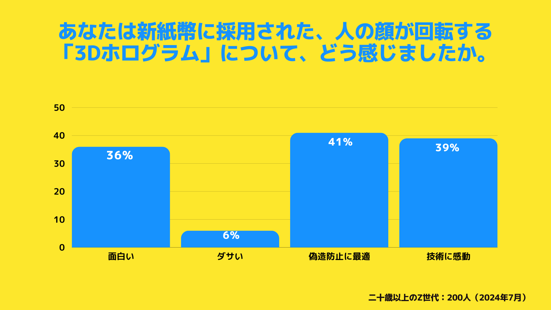 「面白い」「ダサい」と感じている人が一定数存在する一方で、「3Dホログラム」に対して4割が「偽造防止に最適」「技術に感動」と回答しました。