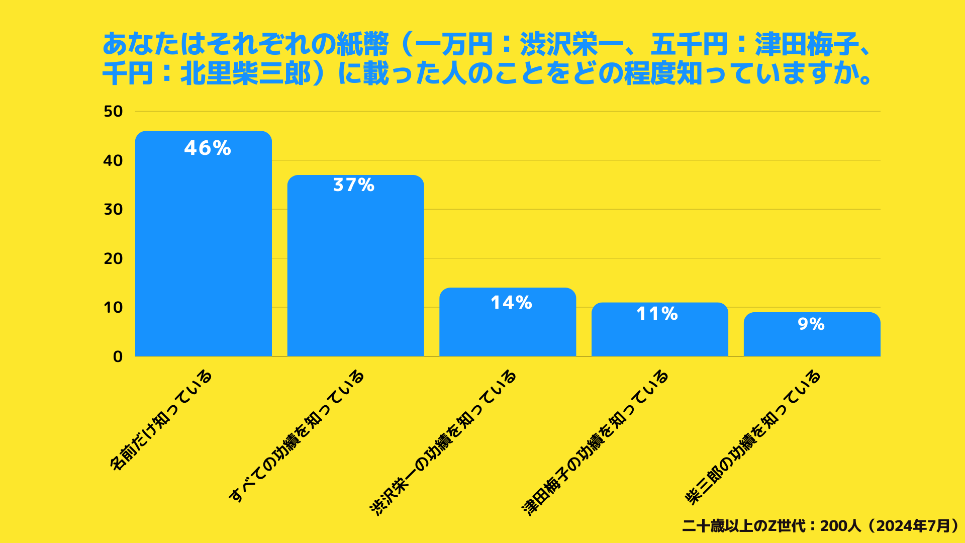 「新紙幣に載っている人のことをぞの程度知っているか」と尋ねたところ、大学生の46%が「名前しか知らない」と回答しました。