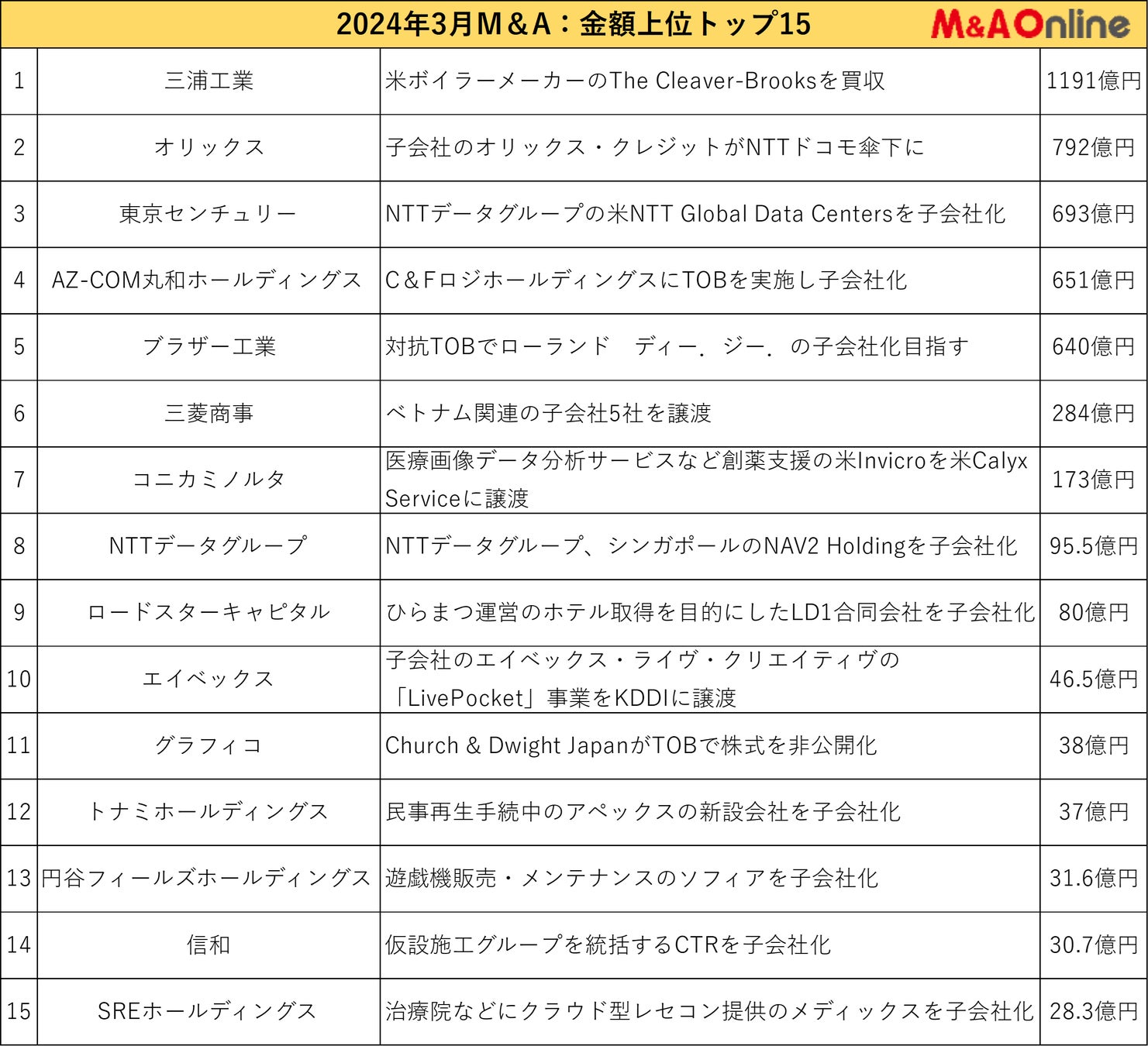 取引総額1位は、三浦工業が米ボイラーメーカーのCleaver-Brooksを約1191億円で買収する案件です。将来の国内人口の減少が見通されるなかで三浦工業は、海外に活路を見出し事業を展開しており、注目したのがサプライチェーンの国内回帰が進む米国でした。同社はCleaver-Brooksを買収し、同社の幅広い製品ラインアップと販路を活用し、米国での市場シェア拡大を目指します。