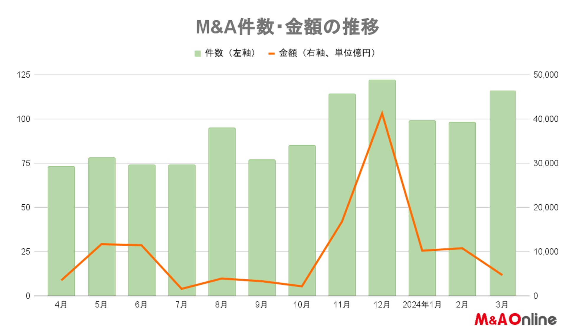 2024年3月のM&A件数(適時開示ベース)は前年同月比13件増の118件となり、前年同月を6カ月連続で上回りました。1-3月の累計も16年ぶりに1000件の大台を突破した2023年を40件上回る315件とハイペースで件数を重ねている一方、取引総額は5063億円と、数千億円規模のメガ案件がゼロで、5カ月連続の1兆円超えはなりませんでした。