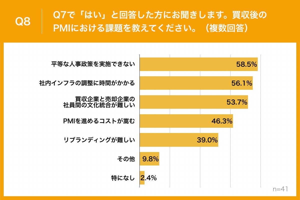 Q7で「はい」と回答した方に、「Q8.買収後のPMIにおける課題を教えてください。(複数回答)」(n=41)と質問したところ、「平等な人事政策を実施できない」が58.5%、「社内インフラの調整に時間がかかる」が56.1%、「買収企業と売却企業の社員間の文化統合が難しい」が53.7%という回答となりました。