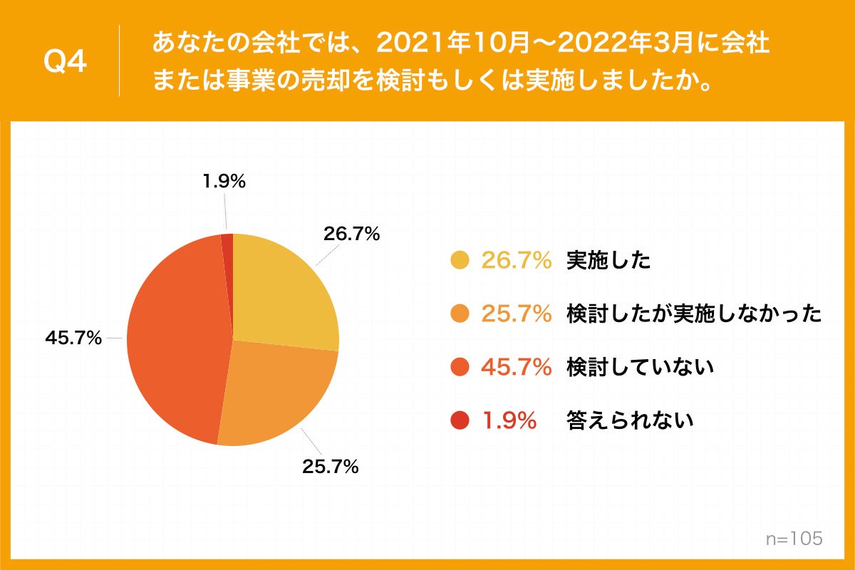 「Q4.あなたの会社では、2021年10月~2022年3月に会社または事業の売却を検討もしくは実施しましたか。」(n=105)と質問したところ、「実施した」が26.7%、「検討したが実施しなかった」が25.7%という回答となりました。