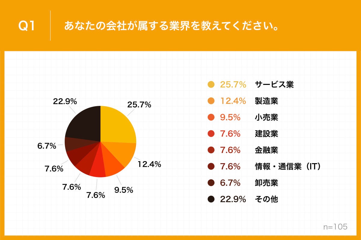「Q1.あなたの会社が属する業界を教えてください。」(n=105)と質問したところ、「サービス業」が25.7%、「製造業」が12.4%という回答となりました。