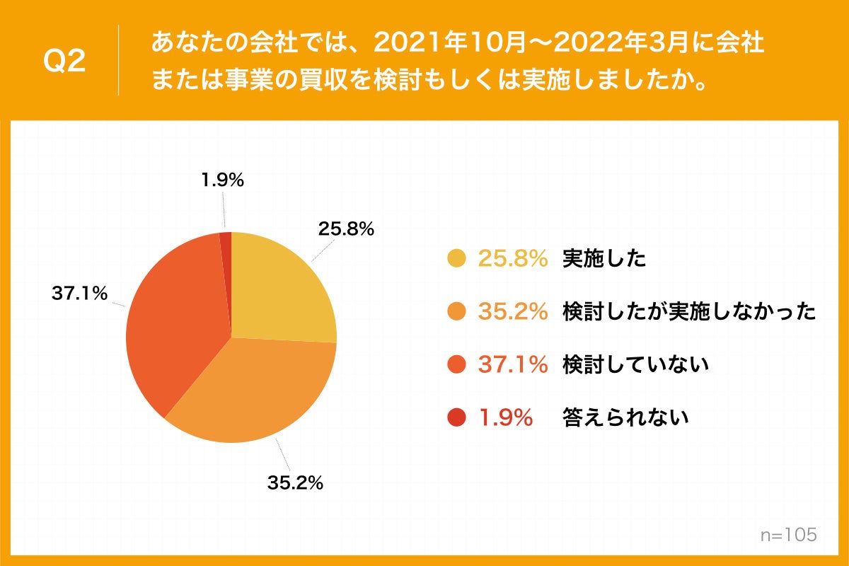 「Q2.あなたの会社では、2021年10月~2022年3月に会社または事業の買収を検討もしくは実施しましたか。」(n=105)と質問したところ、「実施した」が25.8%、「検討したが実施しなかった」が35.2%という回答となりました。
