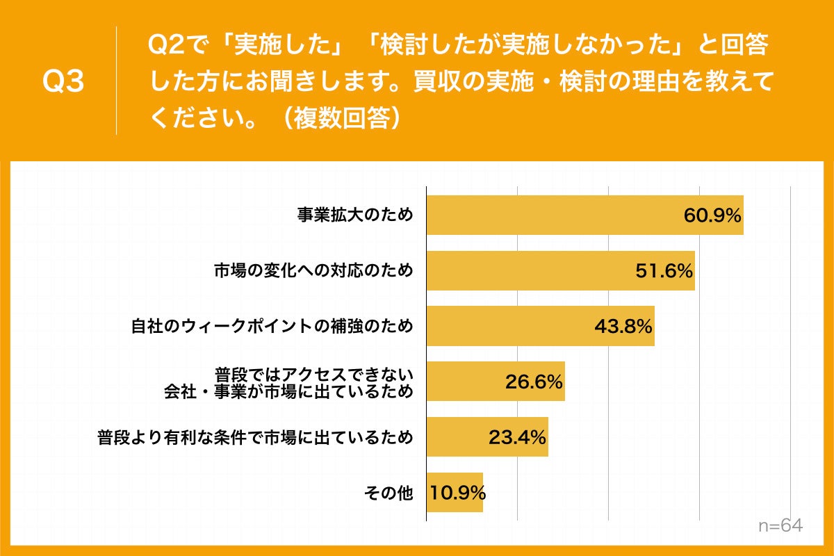 Q2で「実施した」「検討したが実施しなかった」と回答した方に、「Q3.買収の実施・検討の理由を教えてください。(複数回答)」(n=64)と質問したところ、「事業拡大のため」が60.9%、「市場の変化への対応のため」が51.6%、「自社のウィークポイントの補強のため」が43.8%という回答となりました。