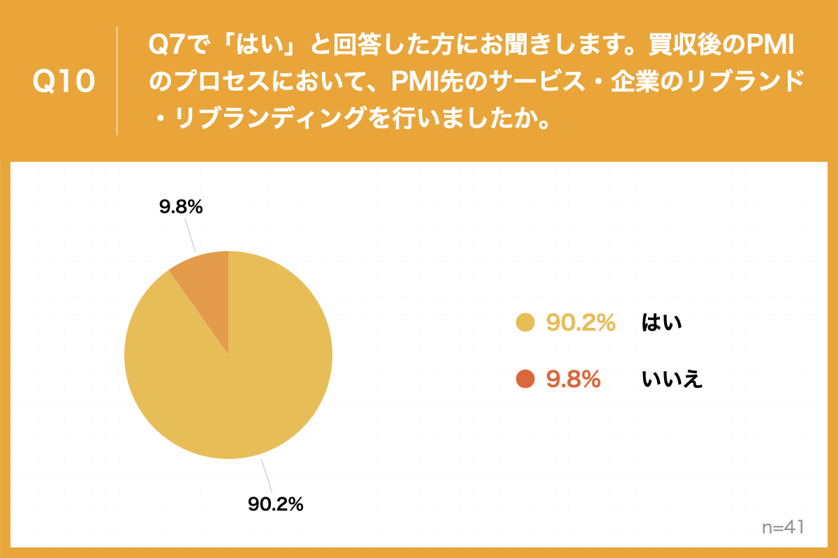 Q7で「はい」と回答した方に、「Q10.買収後のPMIのプロセスにおいて、PMI先のサービス・企業のリブランド・リブランディングを行いましたか。」(n=41)と質問したところ、「はい」が90.2%、「いいえ」が9.8%という回答となりました。