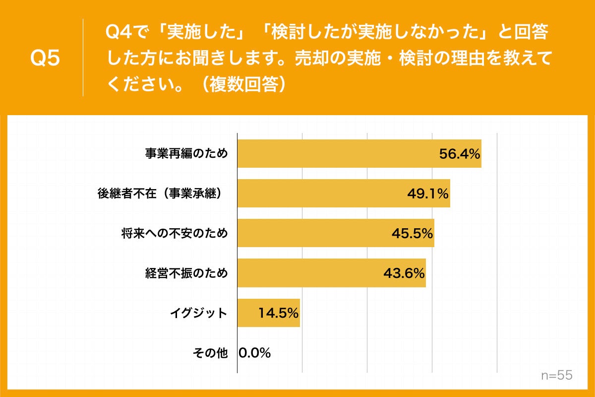 Q4で「実施した」「検討したが実施しなかった」と回答した方に、「Q5.売却の実施・検討の理由を教えてください。(複数回答)」(n=55)と質問したところ、「事業再編のため」が56.4%、「後継者不在(事業承継)」が49.1%、「将来への不安のため」が45.5%という回答となりました。