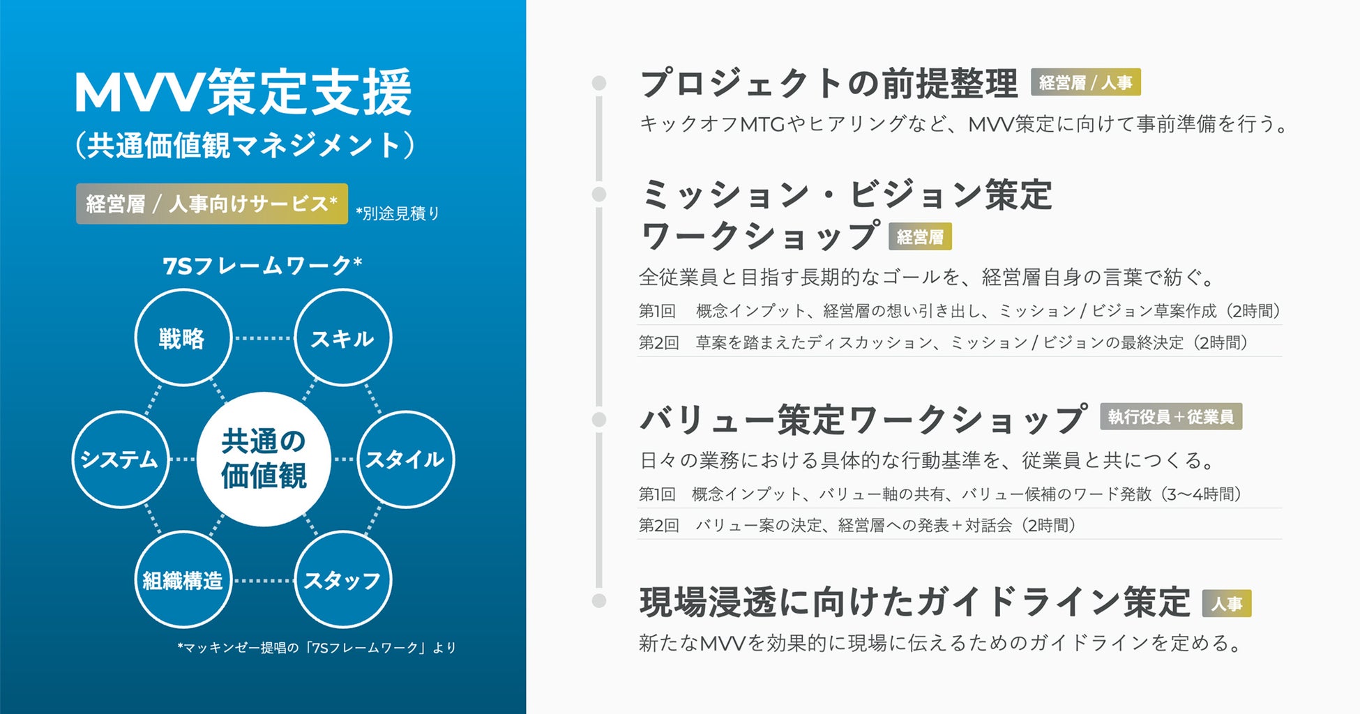 そのため、「MVV策定や見直しといった、"上流"からの支援をしてほしい」と導入企業や導入検討中の経営者や人事等の担当者から求められることが多くなっていました。このような流れから今回、MVV策定についての支援を設計・開発いたしました。