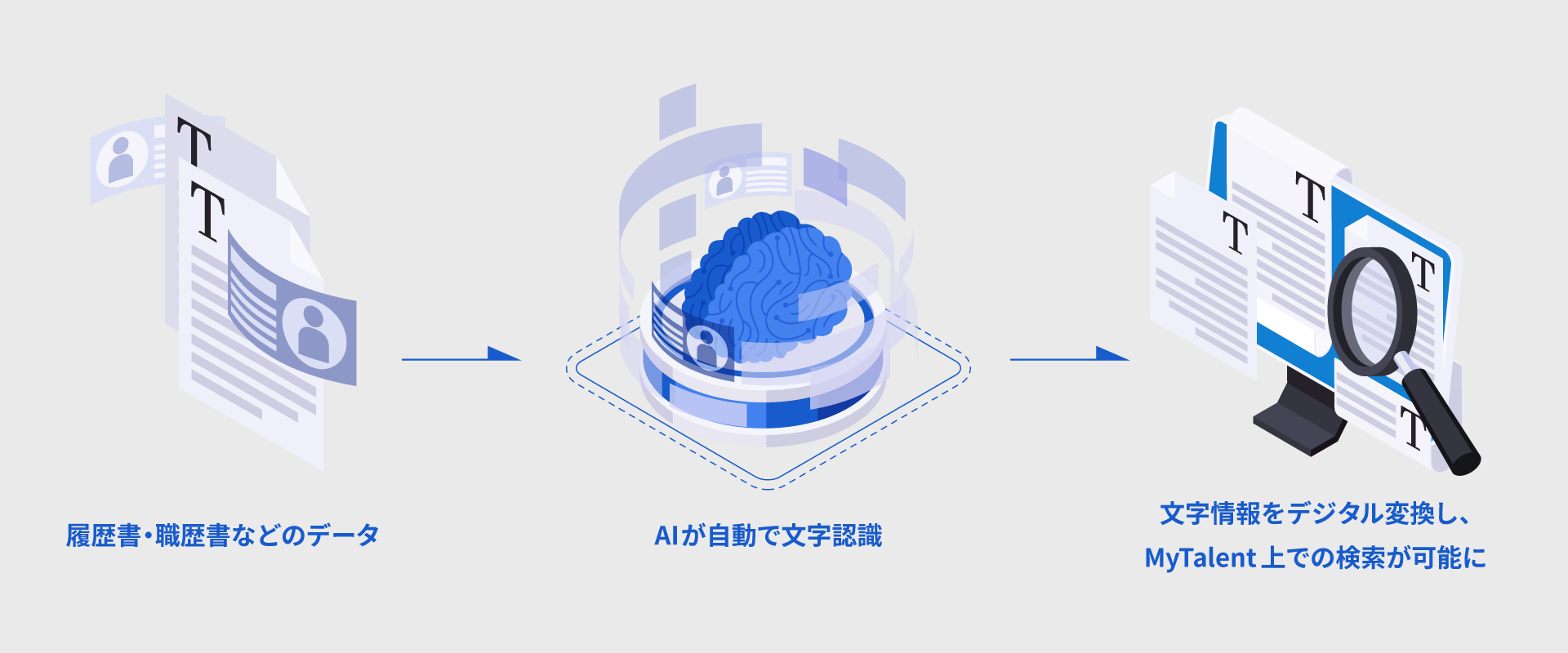 今回の「AI OCR機能」は、生成AIを活用して「MyTalent」にアップロードされている履歴書・職歴書の文字情報を自動で抽出することで、整形されたデータとしてアップロードされていない応募者情報も「MyTalent」上での検索を可能にする機能です。確認工数の削減や構造化されていないデータの見落とし防止により、スカウト業務の効率化と自社にマッチしたスキルセットを持つタレントの検索精度向上を実現します。