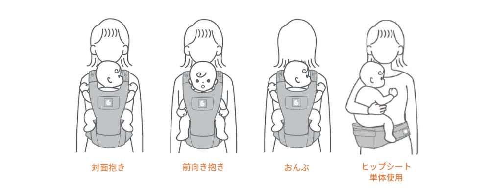 抱き方 :対面抱き、前向き抱き、おんぶ、ヒップシート単体使用