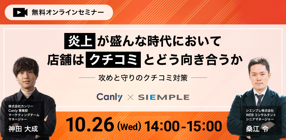 『炎上が盛んな時代において店舗はクチコミとどう向き合うか〜攻めと守りのクチコミ対策〜』シエンプレ×カンリーの共催セミナーを10月26日に開催決定!