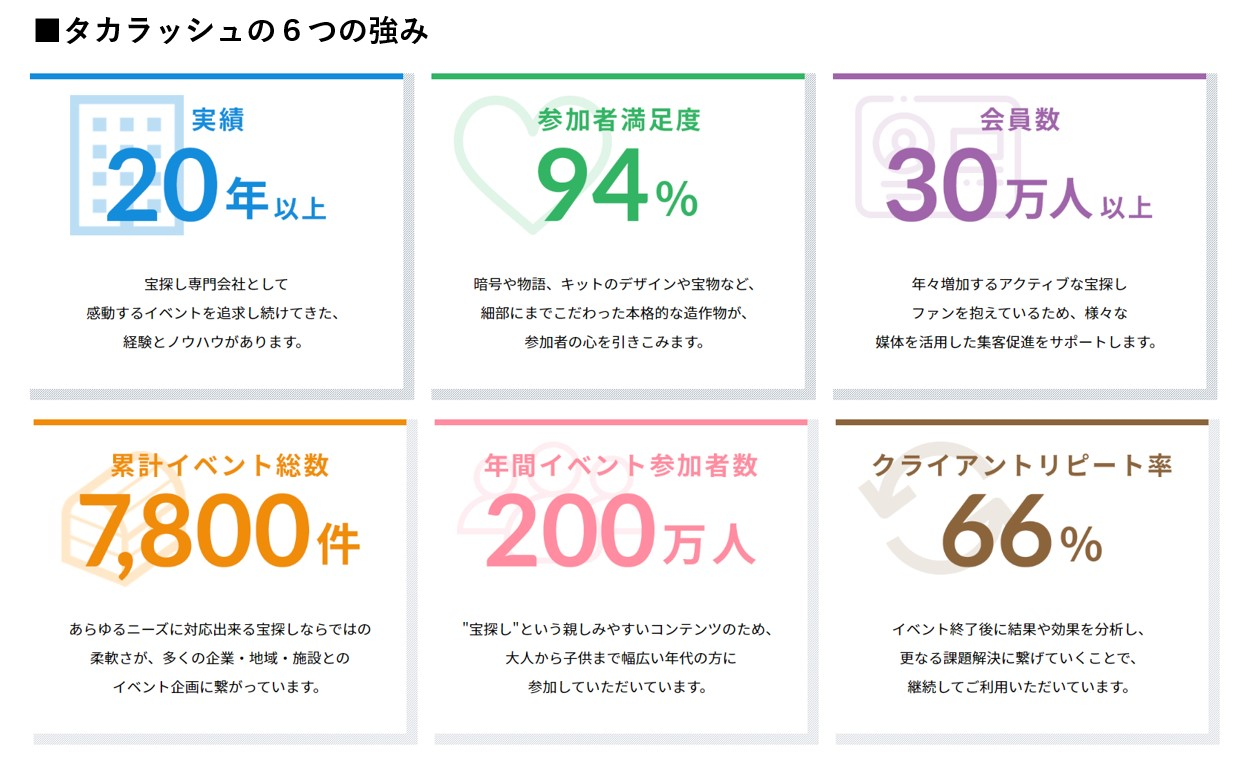 タカラッシュは、創業から20年以上宝探し事業を続けている日本で唯一の「宝探し専門会社」です。宝探しや謎解きイベントなど屋内外問わず、周遊型のイベントを多数実施しています。37万人を超える会員を保有し、多くの企業・地域・施設様とのコラボイベントなどを実施することで、日々新たな経済活動を生み出しています。