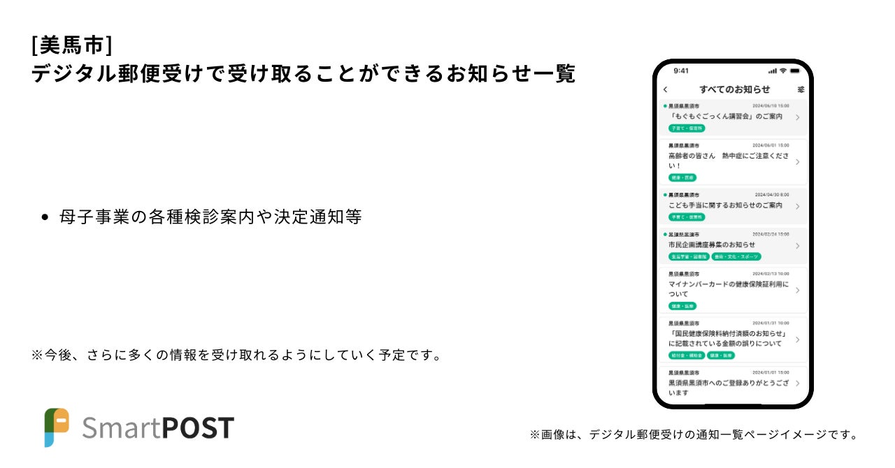 美馬市では「SmartPOST」を活用し、2024年8月に「母子事業の各種検診案内や決定通知等」をデジタル化しました。今後も順次通知物のデジタル化が予定されています。