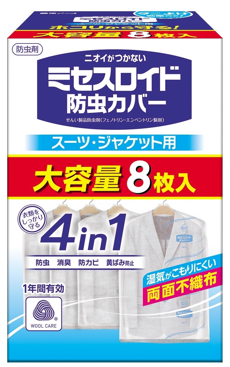 白元アース株式会社(本社:東京都台東区、社長:吉村一人)は、カバータイプの衣類用防虫剤『ミセスロイド防虫カバー スーツ・ジャケット用 8枚入/コート・ワンピース用 6枚入』を2月1日より限定発売いたします。