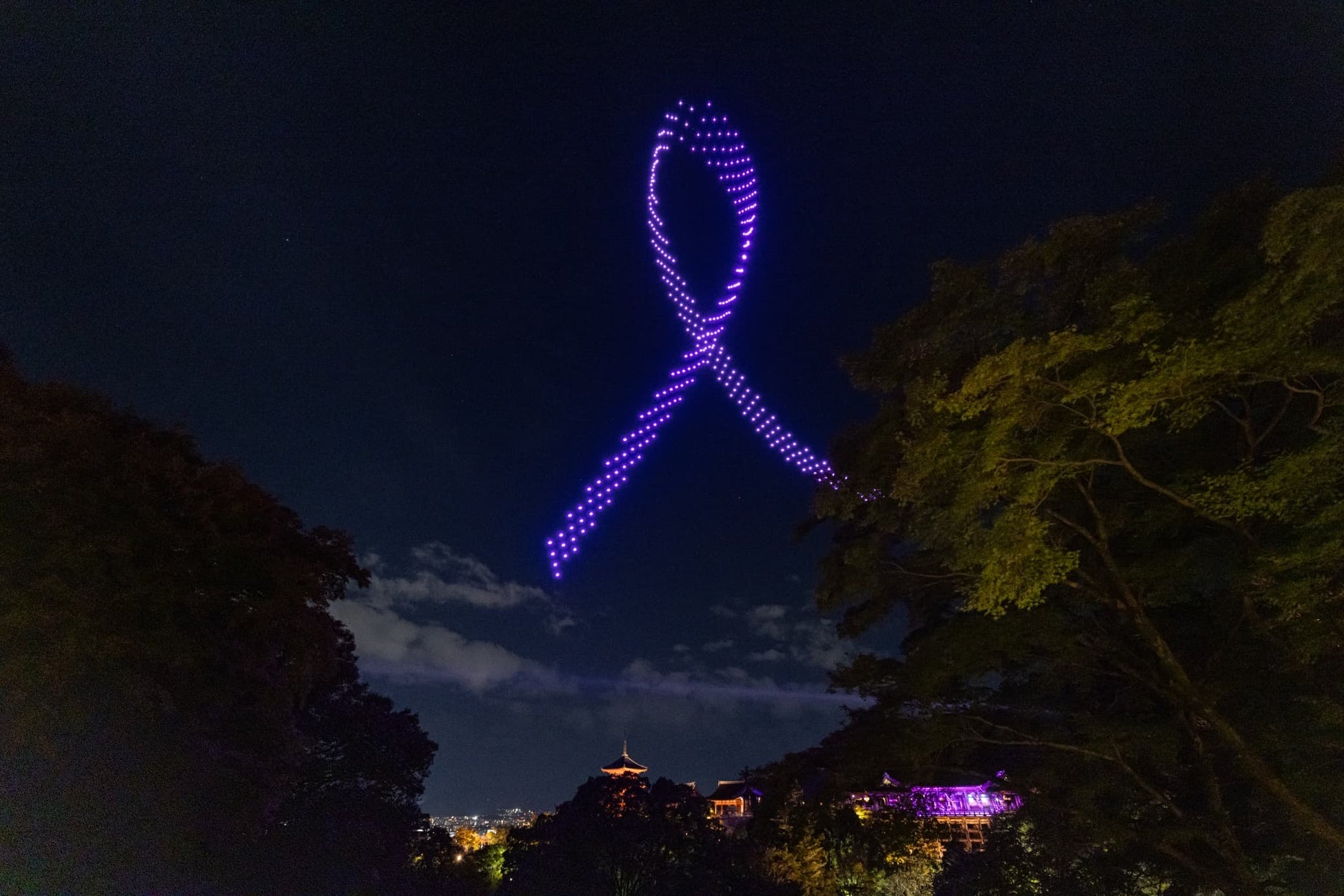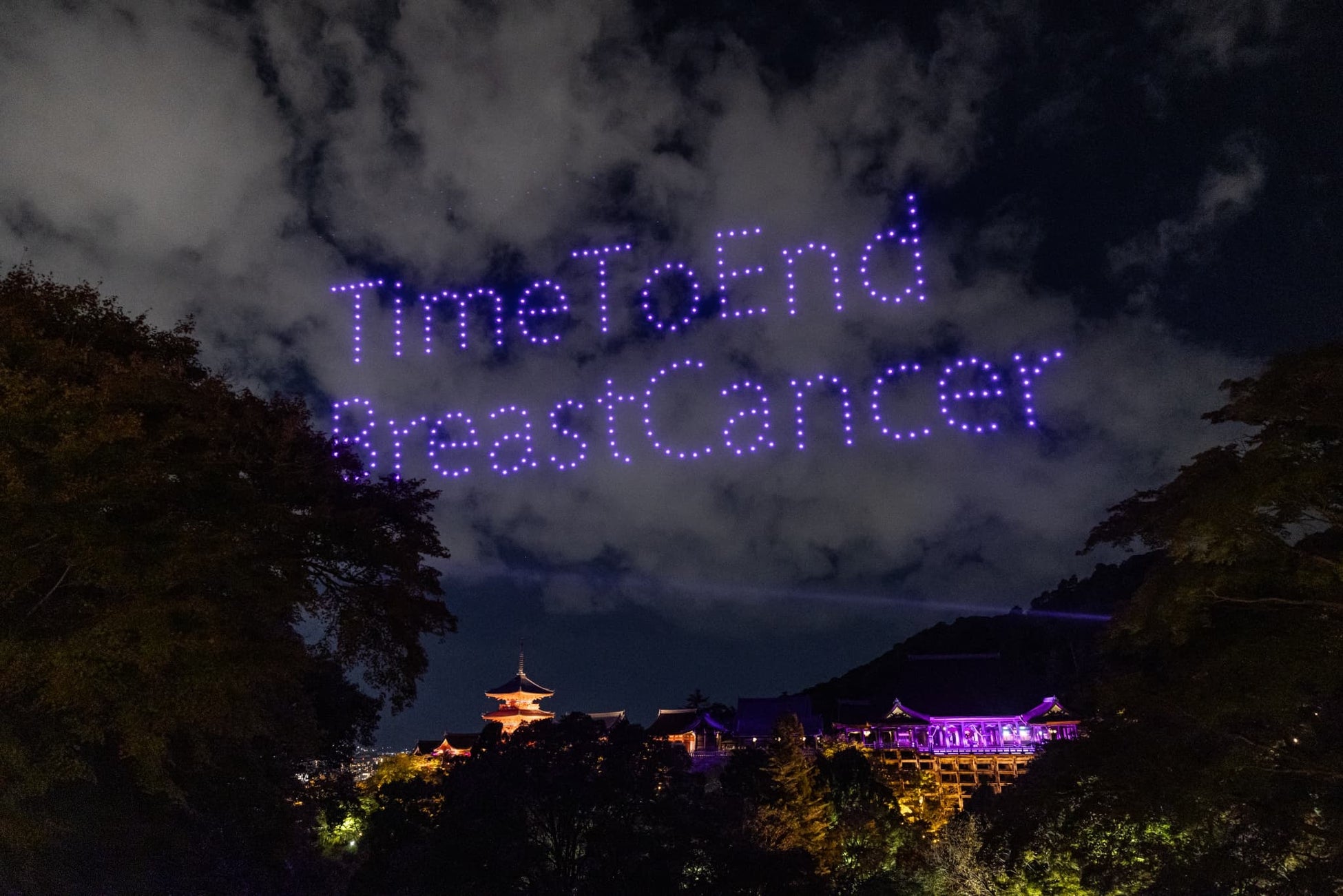 音羽山 清水寺、エスティ ローダー カンパニーズ共催の「乳がんキャンペーン2024」で10月30日に世界文化遺産 音羽山 清水寺にて実施したドローンショーに特別協力